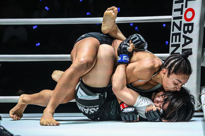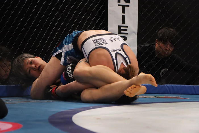 あきぴは3月の前戦でフルコンタクト空手出身のせりなに打撃を出させず一気に詰めてのテイクダウンからパスガード。リアネイキドチョークを極めている。
