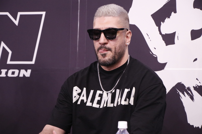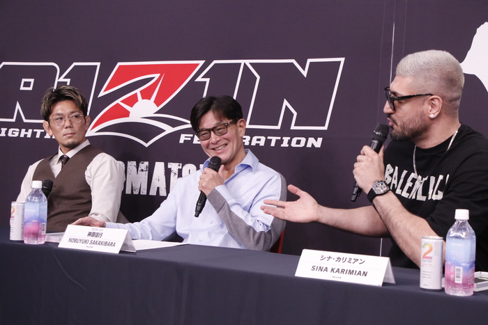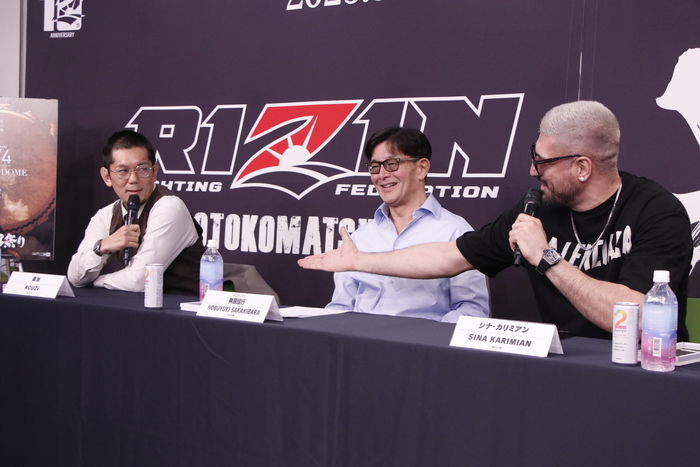 会見の冒頭、榊原信行RIZIN CEOは「皇治の相手が決まりました。2日前に謝罪に来たんですが、その前から皇治とも話をしていてぜひ5月4日は参戦して欲しいと伝えていて。その後に世間を騒がせることがいろいろあって。最終出るか出ないかの話が詰められない中で謝罪をいただきました。深く反省もしているし、戦うことで格闘家なので生き様を見せていくしかない。対戦相手は誰でもいいということで、もう一枚パンチの効いたカードが欲しいなというところで一気に動きました。戦ってやると快諾してくれた選手がいる」と、カリミアンを会見場に呼んだ。