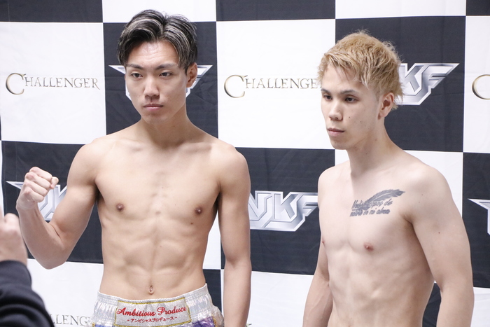 第6試合のNJKFスーパーバンタム級王座決定トーナメント1回戦3分3R延長1Rで対戦する、NJKFスーパーバンタム級3位・繁那(R.S-GYM)は55.30kg、祖根亮麻(大和ジム)は55.05kgでそれぞれ計量をパス。