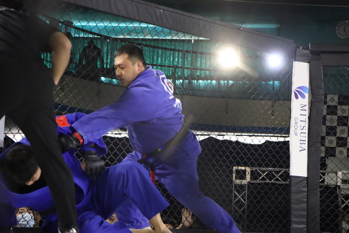 1R、サウスポー構えの中里の左ミドルを掴んだ田馬場がケージに押し込み、道衣を掴んで左ヒザ! 左ストレート&パウンドで試合を決めた。