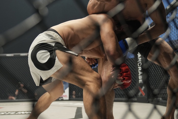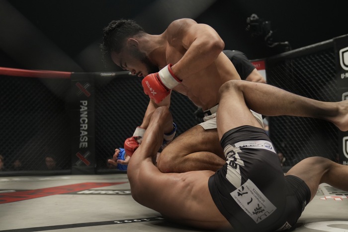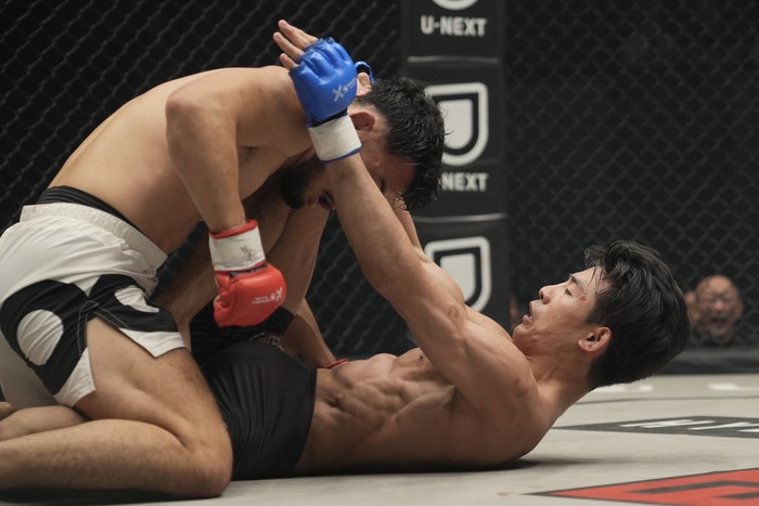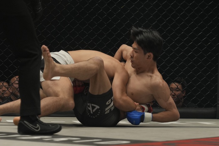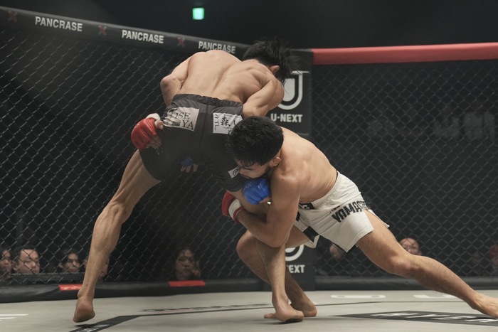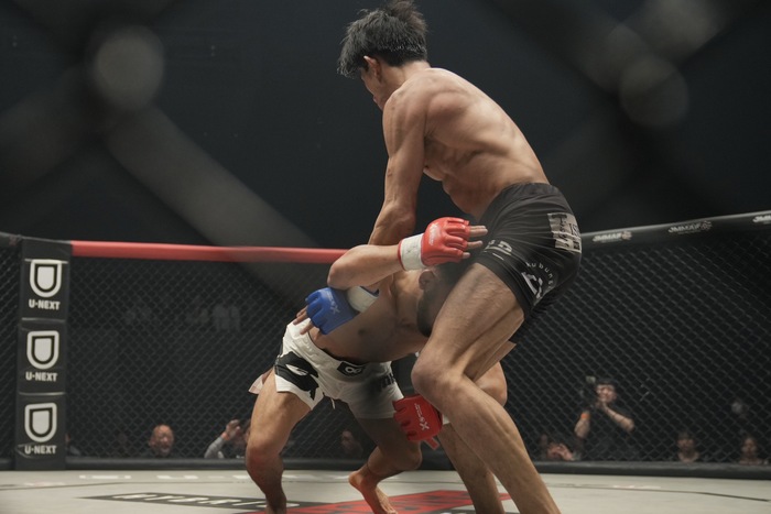 2R、間合いを詰める山口。ケージを背負った平岡にタックルに入る。四つから入れ替えた平岡が離れる。平岡のジャブに山口がシングルレッグからテイクダウン。再びハーフで押さえ込む。パスを狙いながらパウンドを入れていく山口。下で動けない平岡。足を抜いてサイドに出た山口。サイドから肩固めを狙いながらヒジを入れる。平岡がハーフに戻したところで2R終了。