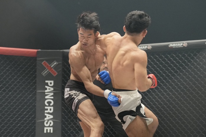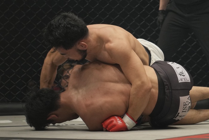 半身になった平岡に強い右のパウンドを入れる。ガードに戻す平岡をすぐにパスした山口。サイドから鉄槌・ヒジを入れていく。またガードに戻そうとした平岡に左右のパウンドを入れる。立った平岡をすぐにテイクダウンしてサイドについた山口。残りわずかでニーオンから左右のパウンドを入れるがタイムアップ。