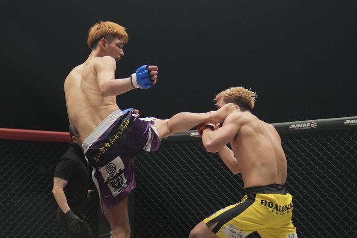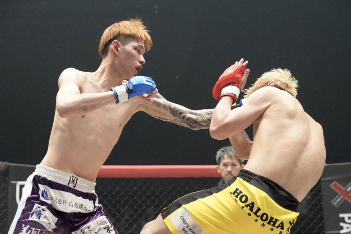 1R、両者オーソドックス。左右のパンチを打ち込む関。カーフキック。リーチに勝る関がジャブで間合いに入らせない。松岡は被弾しながらもカーフキックを返すと足が流れる関。松岡のローにパンチを合わせる関。松岡タックルに入ったが足に触れさせずに切った関。松岡右オーバーハンド。ジャブから右を入れる関。左右の連打。パンチで飛び込んだ関を組み止めてケージに押し込んだ松岡だが、関が振りほどいて離れる。松岡の飛び込んでの右がヒット。松岡のローで左足の太ももが紫に変色している関。1R終了。