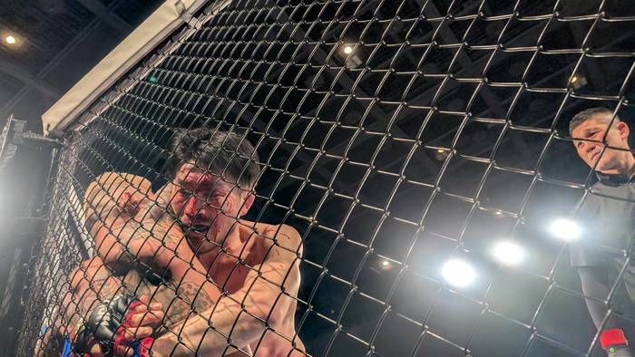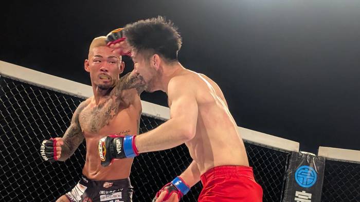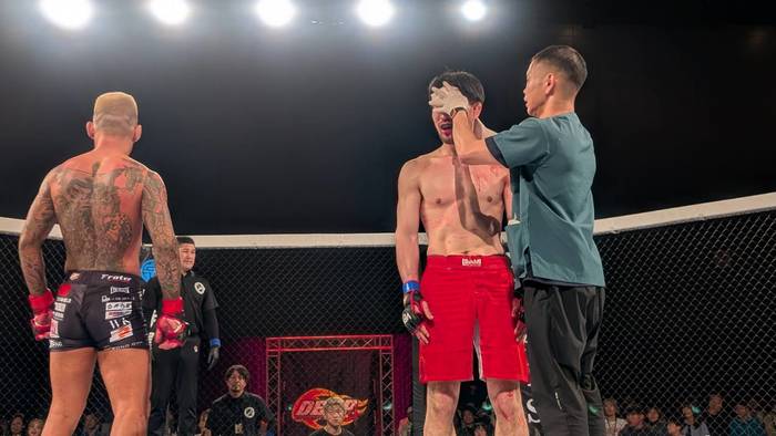 立つ洸助に右足をかけて左手首をコントロールし、右手を喉に。手首を切って正対して離れた洸助。岡田は左前蹴りを腹に突いて詰めると、ノーガードで歩いて前に。洸助は右をヒットさせると左右もヒット。この前進でバッティングか。両者の頭が揺れる。首相撲ヒザの岡田は出血しながらボディロックでテイクダウンを狙うが、ドクターチェックでストップ。