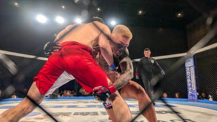 左から右を当てた岡田。左右フックから首相撲の洸助はヒザも、岡田が組んで左ヒザを突く。嫌った洸助が離れたところに右フックをガード上から当てる岡田が前に。さらに左から右を突いて右で差して組んでボディロックテイクダウン。