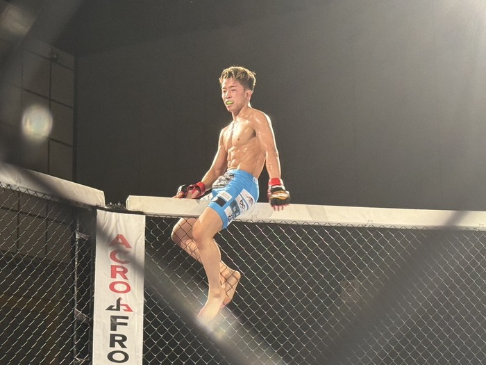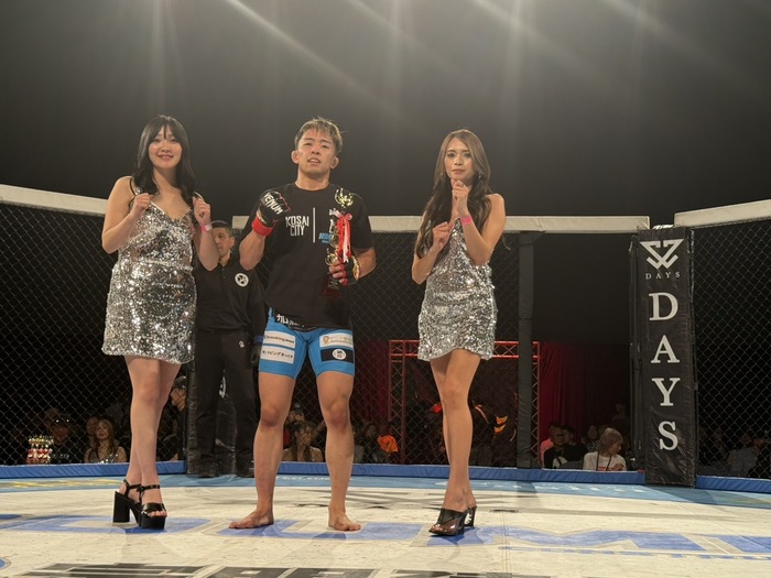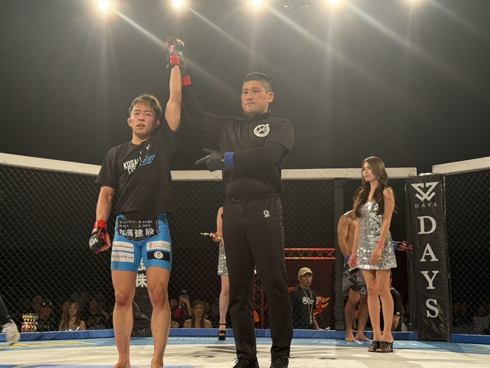 背中着いた松丸はギロチン狙いも首抜く能坂に、金網で上体立てた松丸。そこにバック回る能坂はトップになり肩固め狙いで脇腹に細かいパウンド。スクランブルする松丸に再びバック奪い、リアネイキドチョークでタップ奪った。