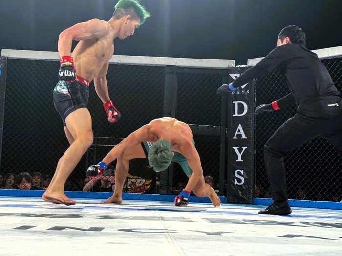 下がった森の右に鈴木は右から左を当てると、森は足をもつらせ後方にもつれてダウン。パウンドで飛び込む鈴木は、右ヒジ。右で差して立ち上がる森に右ヒザを突き、左小手で崩すが、離れる森。