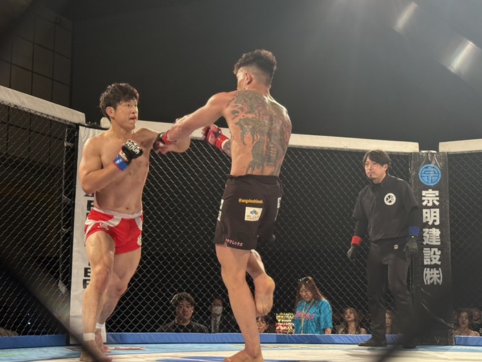 1R、サウスポー構えの小林の左ローの打ち終わりにオーソの篠原は左右で突進。右差しの篠原に左小手の小林。押し込み左ヒザの篠原は右ヒザも。首相撲で回そうとする小林のヒザがローブローに。