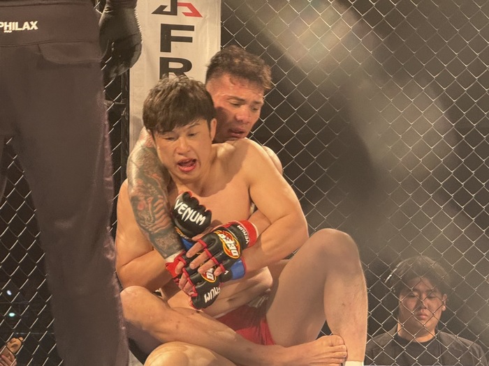 2R、喧嘩四つでともい左の蹴り。左ハイの小林に右を突いて強引に詰める篠原がシングルレッグで片ヒザを着かせるが、その下がった頭にヒジを落とす小林。なおも崩す篠原がバック奪取。両足を巻いた篠原は4の字ロックでコントロール。背後からリアネイキドチョーク狙い。ロイバルvs.平良戦のように正座してずらして横に落とした小林が上に。