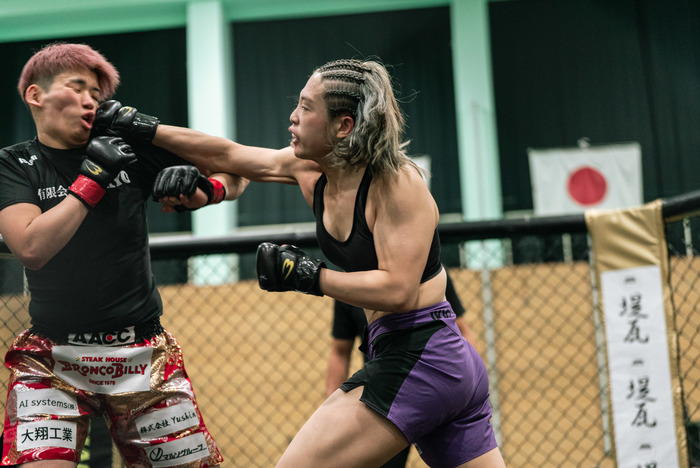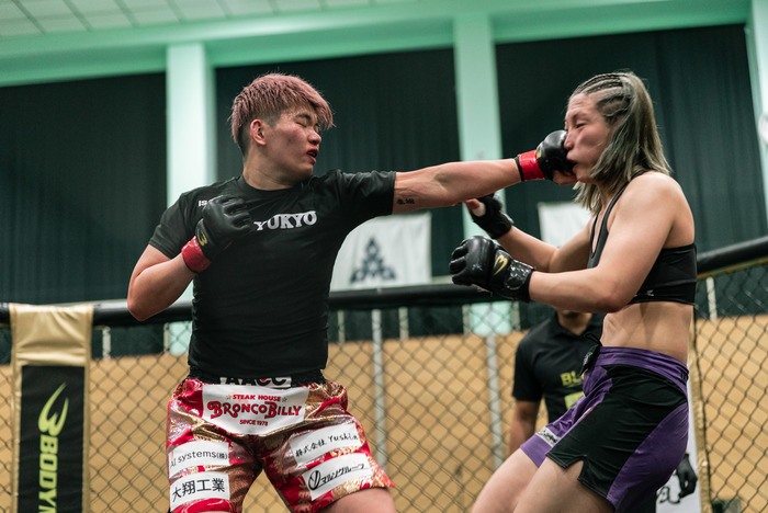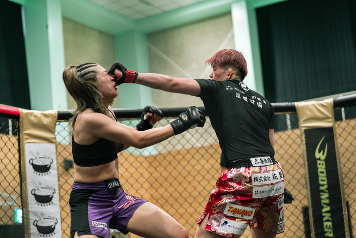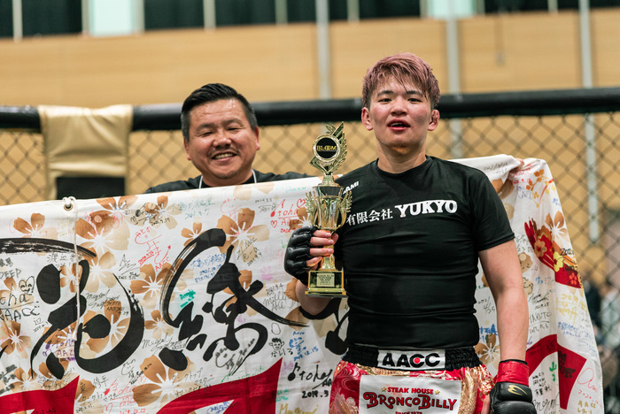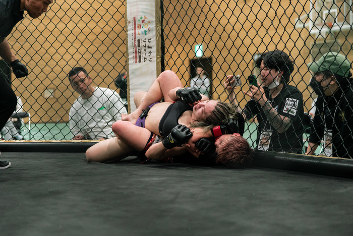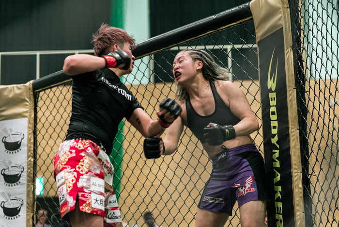 口から出血も歓喜の中尾はマイクを渡され「九州の皆さんはじめまして、修斗から来ましたAACCの中尾あづきです。まずはじめに団体初の女子カードを作っていただいたBLOOM関係者の皆さんと、韓国からわざわざ足を運んで来てくれたジュギョン選手、ほんとうにありがとうございました。どうしても地元で試合をしたくて、お願いしてジュギョ出させていただいたんですけど、ジュギョン選手と1回練習したときに打撃でボコボコにされて打撃、怖かったんですけど、皆さんの応援が力になりました。自分は柔術と総合格闘技の二刀流を目指していて、センスも才能も無い、ただの凡人ですが、格闘技でひとはな咲かせられるように頑張るのでこれからも応援よろしくお願いします」と語り、大きな拍手を受けると、最後にセコンドの阿部裕幸代表に感謝の言葉で締めた。