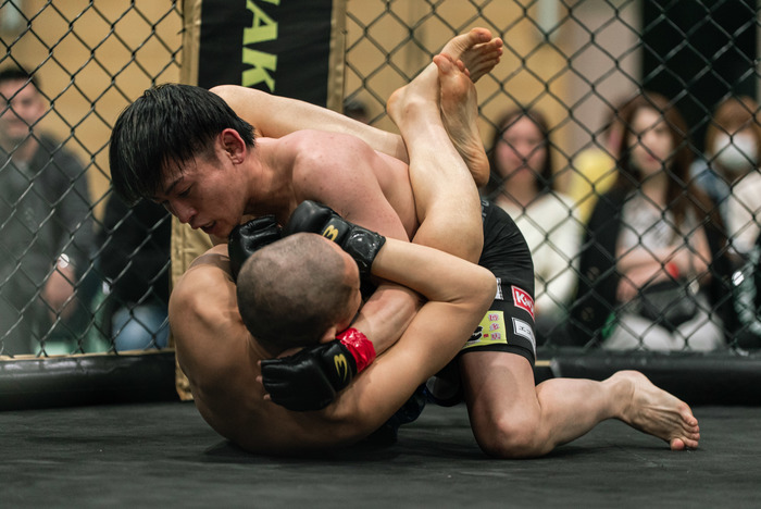 2R、中央を取る泰斗。木内の入りに左右をまとめる。左前蹴りの木内をかわすと右オーバーハンド。ブロッキングの木内は左ミドル、左ストレート。遠間からシングルレッグで引き込み。左手で腰を抱きに行く泰斗に木内はオーバーフックから1R同様に右ヒザ裏から泰斗の肩を右手で抱いてクローズドから三角、オモプラッタ狙い。左腕を巻き込む。脇腹にパウンドの泰斗。左腕を抜く。下から4の字ロックの木内は、左脇下に頭を入れた泰斗にネルソン狙うが、すぐに頭抜く泰斗は、木内のラバーを抜いて左拳で細かい鉄槌。ラスト10秒で立ち上がり足を蹴りゴング。