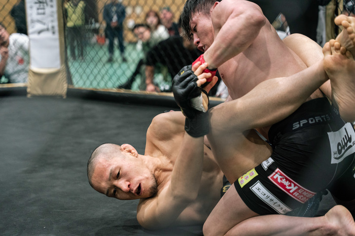1R、オーソの泰斗に、サウスポー構えの木内が先に長い左ミドルを当てる。さらに左ヒザ。詰める泰斗は左フックから右ストレートでダウンを奪うとパウンドに。そこに三角を合わせに行く木内に三角を作らせず、左足を抜いた泰斗。木内は左を差してからガードを作り直し、腕十字、三角狙い。正対し鉄槌を突く泰斗。木内は右手で左肩を抱き、その上から右足をかぶせる得意のラバーガード。上の泰斗はコツコツ脇にヒジ。