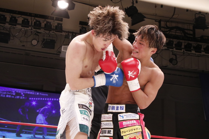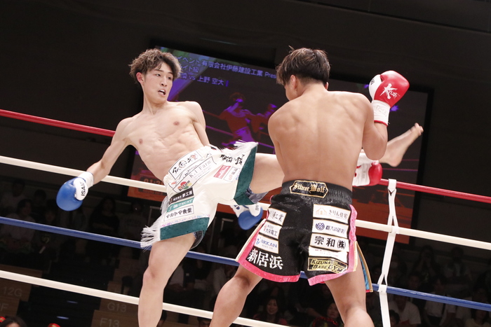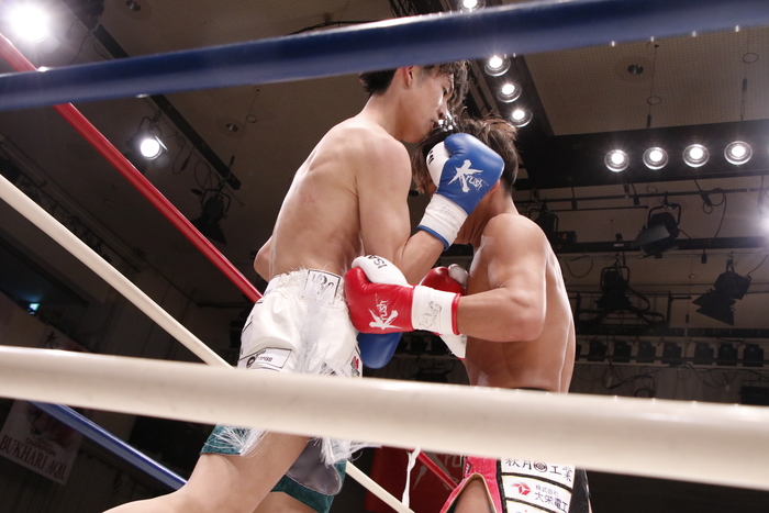 2R、上野はジャブを突いて距離を作り、左ローを集中して蹴る。児玉はやはり距離を詰めて左ボディ、左右フック。上野も至近距離でパンチをヒットさせるが、児玉は左右フックを打ち返す。児玉のパンチに上野はヒザで応戦。