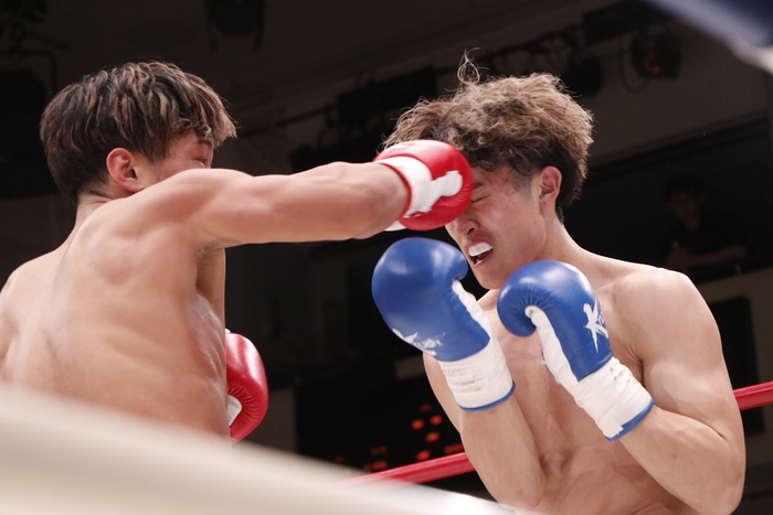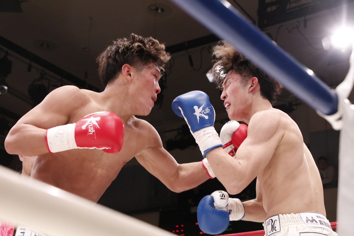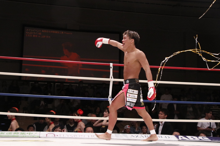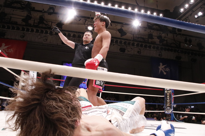 3R、児玉が勝負を懸けて打ち合いに行くと上野もこれに応戦。すると児玉はここで右カーフを蹴る。上野も蹴り返すと児玉は距離を詰めて左右フック連打。上野も打ち合うが児玉の左右フックが次々とヒット。右アッパーも。最後は左フックで上野がダウン、様子を見てレフェリーがストップした。