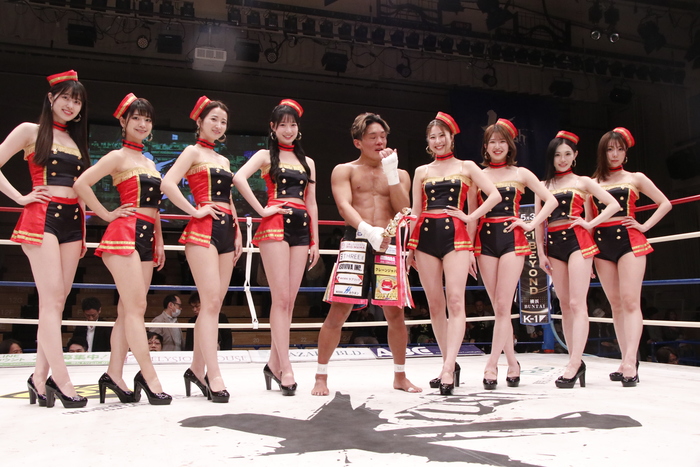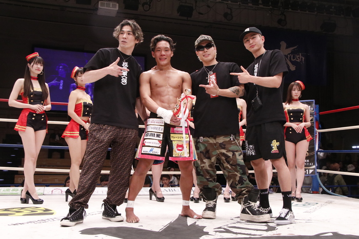 壮絶な打ち合いでKO勝ちを飾った児玉は超ハイテンションでリングの上をウォーク。マイクを持つと「何も言うこと考えていなかったから以上」と、反乱軍、同門の塚本らと勝利を喜んだ。