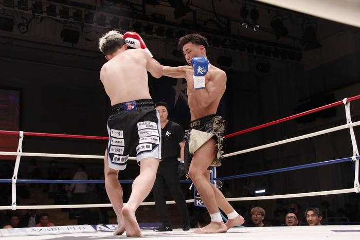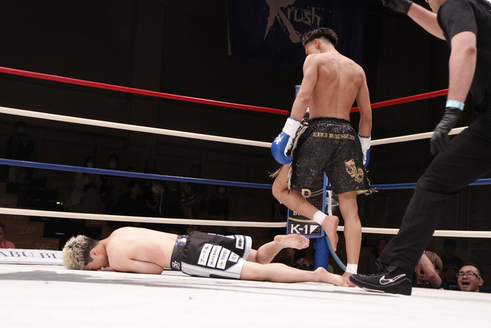 1R、松谷は遠い距離からジャブ、横蹴りを放ち、右カーフを蹴る田中に右ストレート。ジャブから一気に近づくとパンチをまとめ、切れ味鋭い左フックでダウンを奪う。最後も左フックでダウンを奪い、レフェリーがここでストップ。松谷三兄妹の次男が衝撃のデビューを飾った。