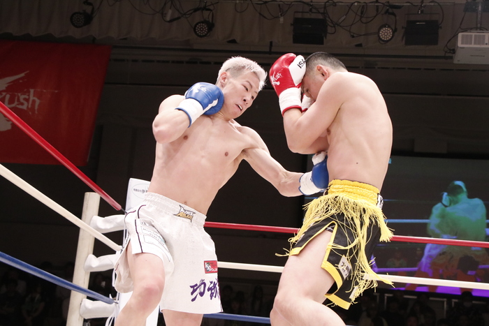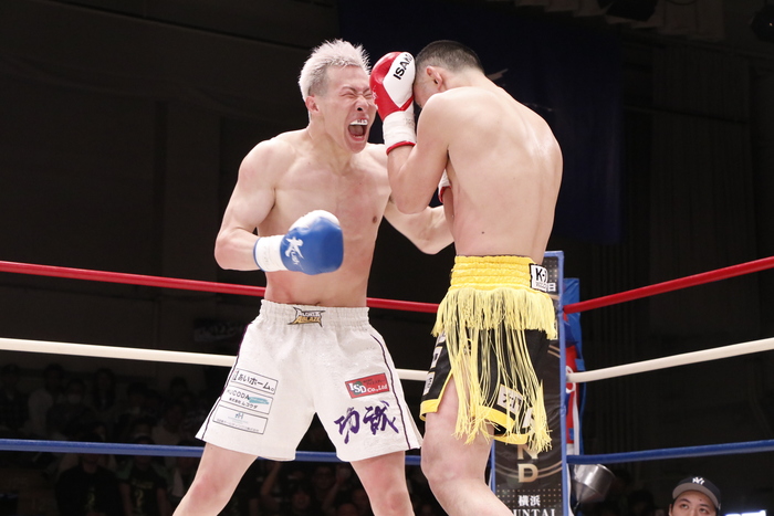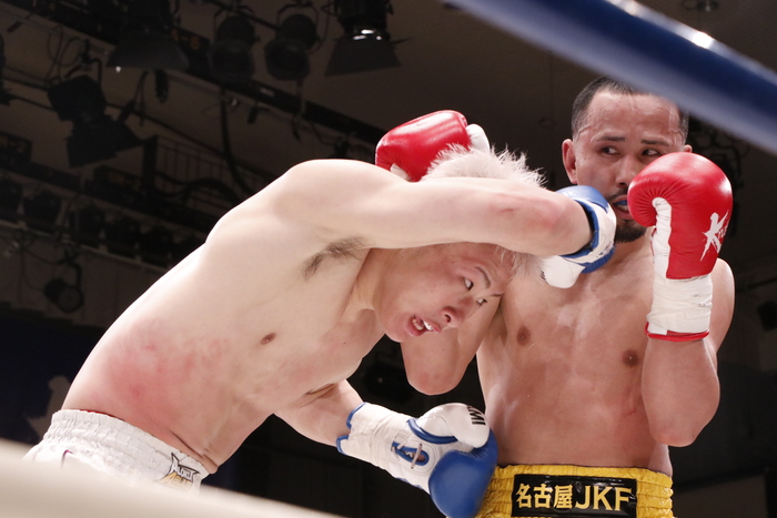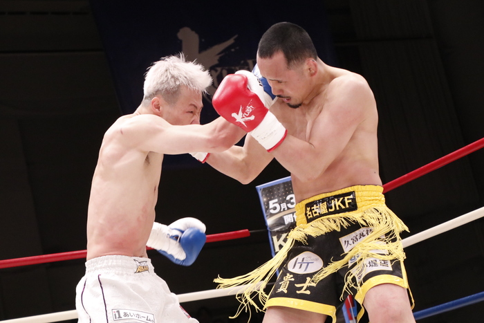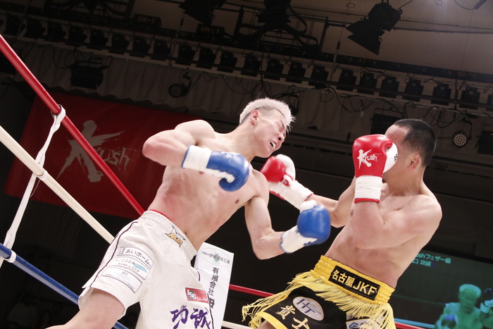 2R、前へ出る新美は左ミドルと左ストレート、関口は強烈な左ボディ、左右フックで応戦する。新美と同じ手数で勝負する関口だが、一発一発の重さで優る。新美が左ミドルと左ストレートをヒットさせて優勢も、関口も終盤巻き返した。