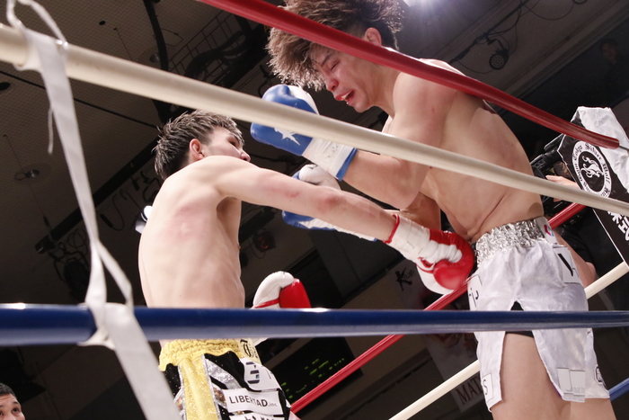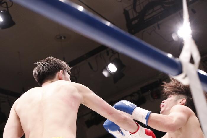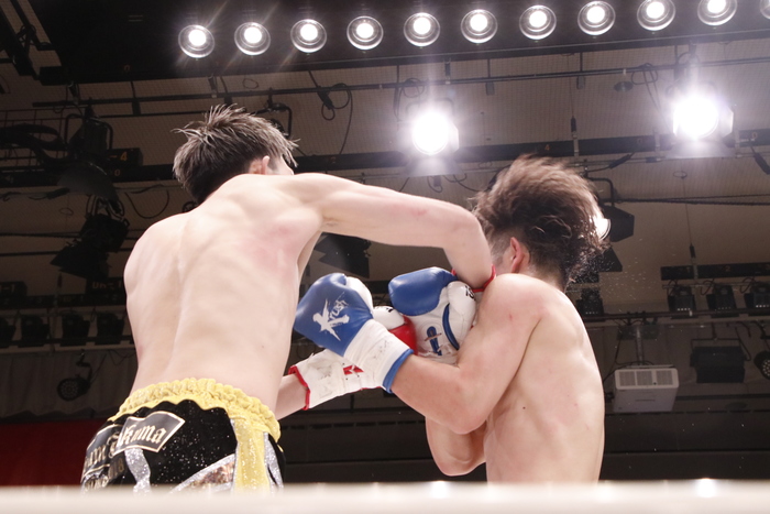 1R、カーフの蹴り合いから右ストレートで前進するのは塚本。岩﨑も右のショートをヒットさせるが、終盤に塚本が右ストレートを連続ヒットさせた。