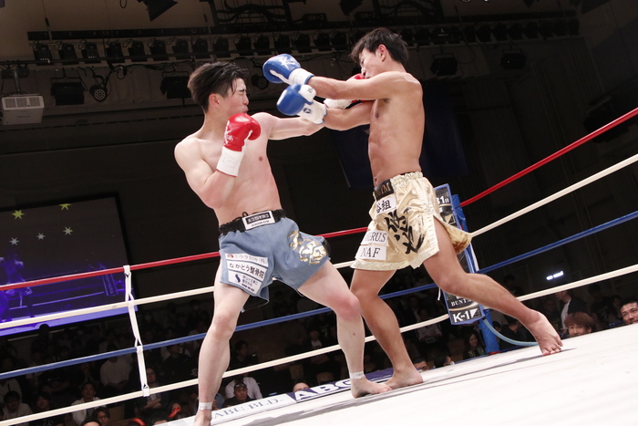 2Rも鵜澤が左ミドルを蹴り、右アッパーを見せてからの左フックを当てていく。板橋は右の三日月。