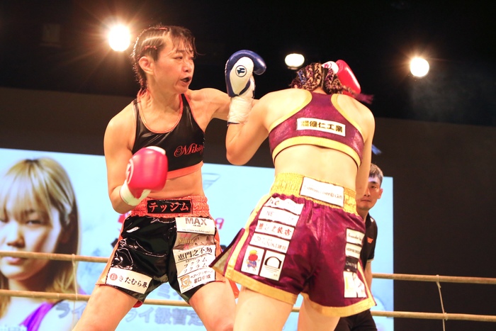 勝った堀田は「拳之会興行でタイトルマッチができるということで、楽しみな気持ちもあったんですけど、怖い気持ちもたくさんあって。練習でもSAHOちゃん、珠璃ちゃんにボコボコにされて心が折れそうな時もあったんですけど、ここでベルトを巻いて、頑張ってきた甲斐があったなって、メッチャ思いました。今後も世界に挑みたいし、KNOCK OUTで対戦したいぱんちゃん璃奈選手もいるので、そこを目指して頑張っていきます」とマイクでコメントした。