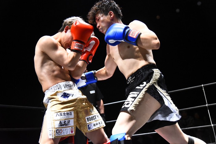 宮崎県小林市出身の第6代K-1 WORLD GPフェザー級王者・寺田が凱旋、主催するCLIMB GYMの看板選手で35戦18勝15敗2分の河野とエキシビションマッチで対戦した。河野は今年2月のKrushに参戦し、岩尾力と対戦経験もある。