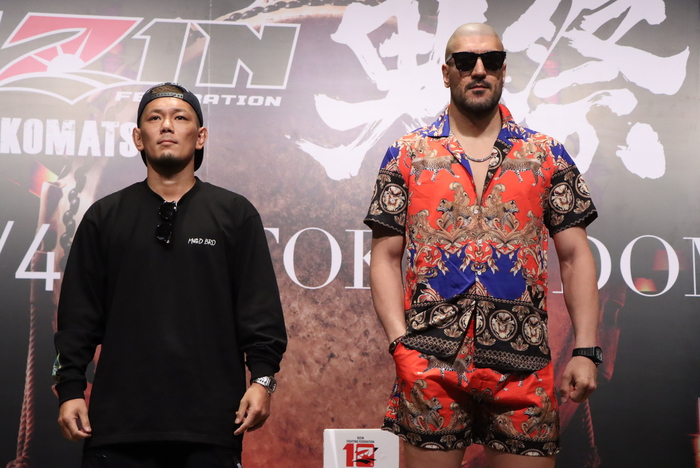 第9試合のRIZINスタンディングバウト特別ルール98.0kg契約3分3Rで対戦する、皇治(TEAM ONE)は70.4kg、シナ・カリミアン(SINA ARMY)は98.0kgで約28kg差となった。