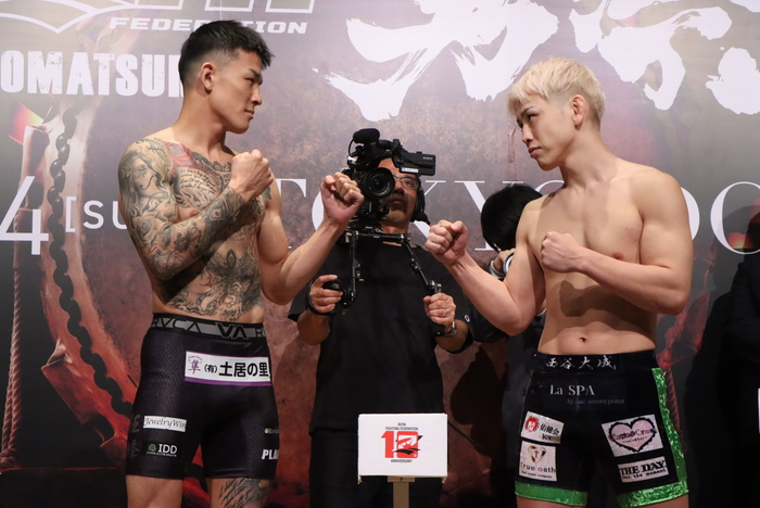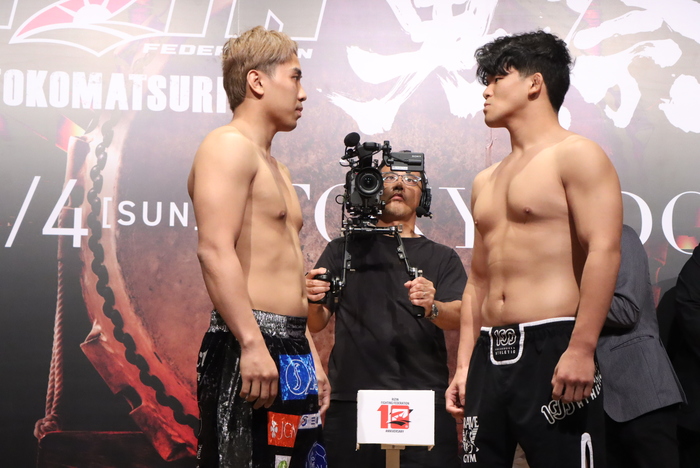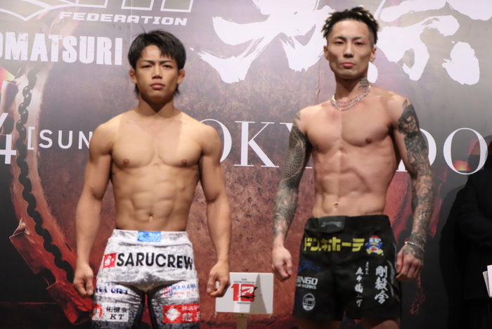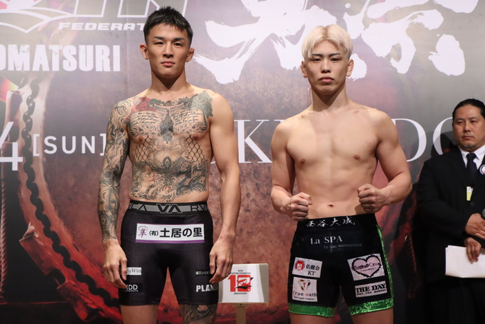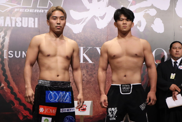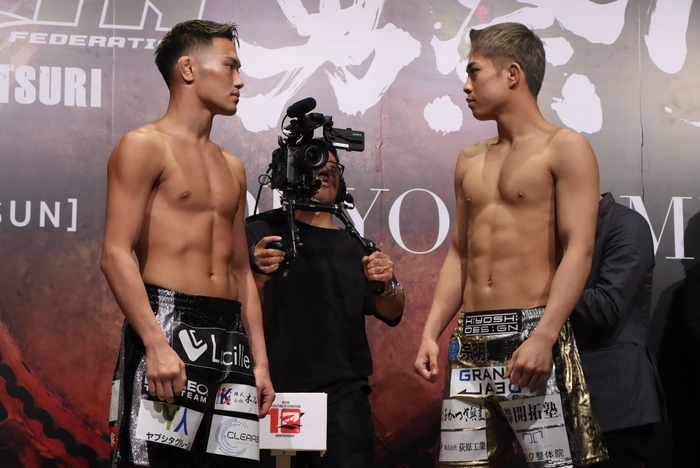 第5試合のフライ級(-57.0kg契約)5分3Rで対戦する、ヒロヤ(JAPAN TOP TEAM)は56.95kg、篠塚辰樹(MASTER BRIDGE/剛毅會)は56.95kgでそれぞれ計量をパス。