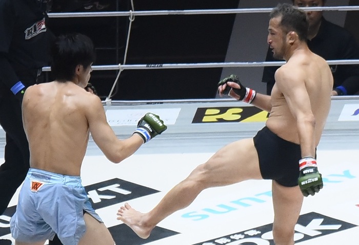 再開。右前手フックから左ストレート、左ミドルで詰める桜庭はバックフィストも狙う。
