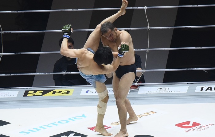 2R、リーチ、コンパス、階級差を活かして前に出る桜庭に、右フックから左を当てて腰を落とさせた中村は、桜庭の立ち際に右手首を掴んでアームロック狙い。さらに足を戻してきた桜庭を担ぎパスからマウント。S字マウントから腕十字、いったん脇に挟んでから胸上に置き、ヒジを伸ばして極めた。