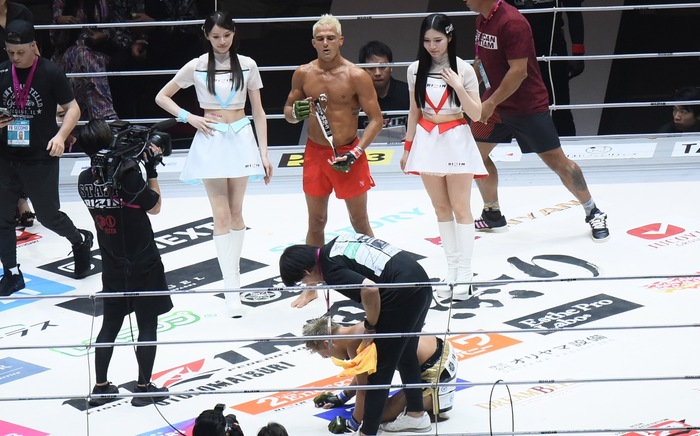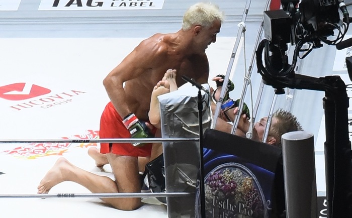 3R、サバテロの右ローの打ち終わりにダブルレッグで肩口まで担ぎ上げた太田が、前方にスラム! しかしサバテロの身体のひねりに顔からマットに落ちた太田は目がうつろに。上を取ったサバテロが左のパウンドを5連打でレフェリーが間に入った。