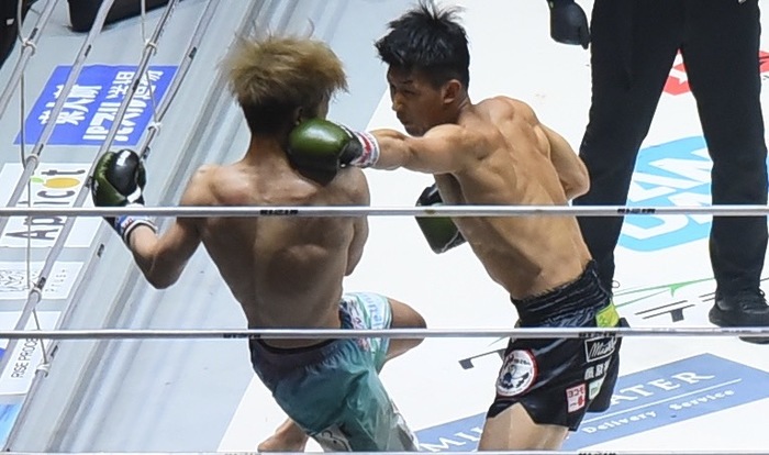 1R、ステップを踏んで左右に動くウザ強に朝久は右ロー、ウザ強は走ってリングを回り込んで朝久の攻撃から逃げる。しかし、いきなり飛び込んでのスーパーマンパンチや朝久が近付いてきたところに左右フックとトリッキーな攻撃。リング上をスキップするように広く使うウザ強。朝久はいらだったか、ブレイク後に攻撃して警告を受ける。