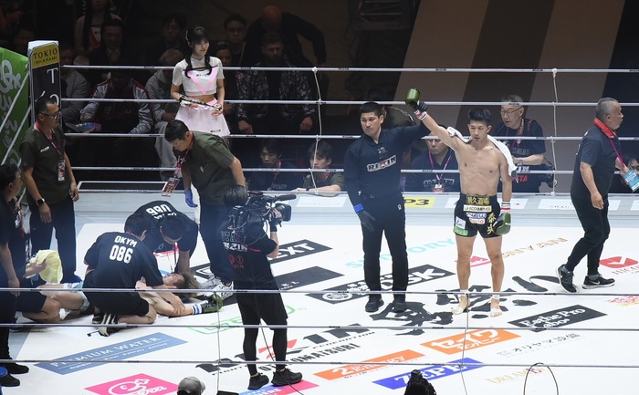 2R、じりじりと詰める朝久にウザ強はバックハンドブローを放つが空振り、朝久の左右フックでダウンを喫する。朝久がバックハンドブローから左ミドル、ウザ強もバックハンドを返す。ウザ強はダメージからスリップするも立ち上がるのに時間がかかる。朝久が左ストレートから左ハイキックを放つとこれが見事に決まり、ウザ強は崩れ落ちてダウン。朝久のKO勝ちとなった。
