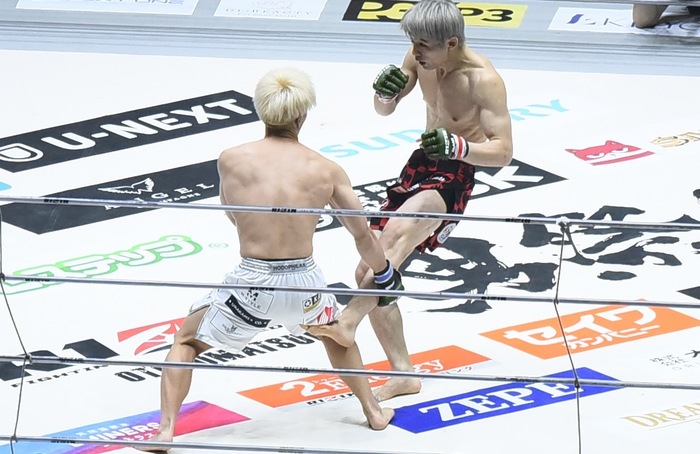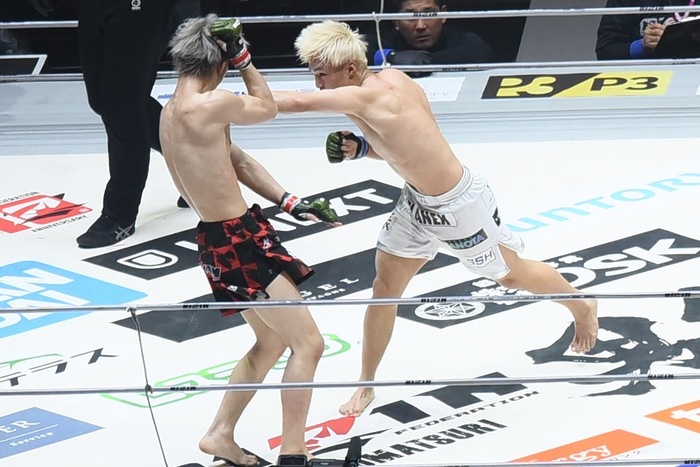 2R、田丸の左カーフに右足が流れる平本。左ストレートを打つ平本にバックステップでかわした田丸が左カーフ。田丸はジャブを打って左カーフを蹴る。ジャブに平本が組み付き、田丸が受け止めて上になるが、すぐに平本が上を奪い返す。