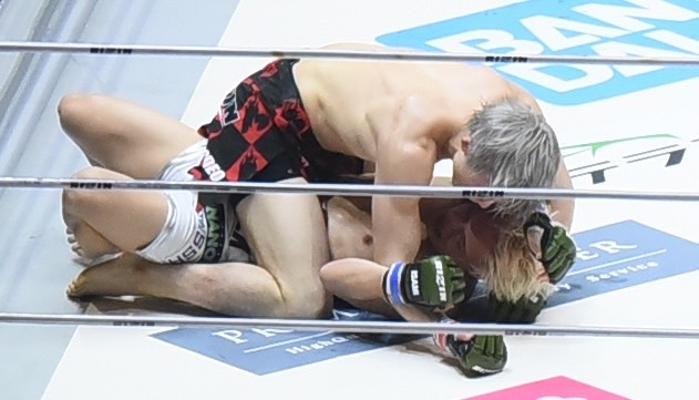 平本が左カーフからの左ストレートを打つと田丸が自分から組み付きに行ったが、首投げで平本がテイクダウン。すかさず下から蹴り上げた田丸だが平本が抑え込む。ハーフから鉄槌を打つ平本。マウントを奪い、抱き着く田丸にパウンド。