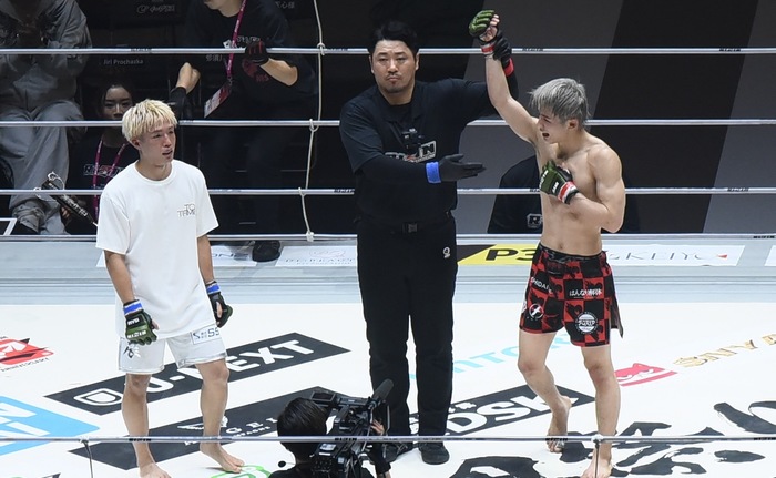 平本が上体をあげたところで田丸が両足を頭部へ絡めに行ったが、平本が払ってマウントへ。パウンド連打に田丸はブリッジして立ち上がるが、平本は離れず再びテイクダウン。ここで試合終了。