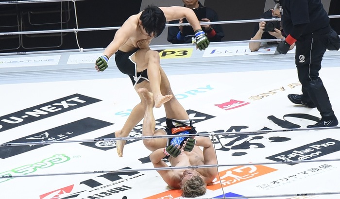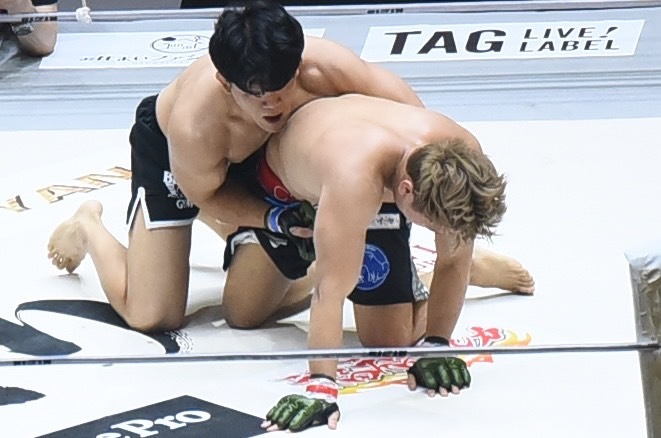 2R、再びイマナリロールの佐々木をかわし、バックを奪う中谷。さらにガブって頭部へヒザを打つ。サイドから首を抱える中谷はパウンド、ボディへのヒザを打ちながら肩固め狙い。一度解除するとノースサウスチョークへ移行も佐々木にハーフに戻される。立ち上がる佐々木のバックに付く中谷。ダブルレッグでテイクダウンし、バックからパンチを見舞う。佐々木は前転して足関節を狙うが中谷は離れ、顔面へサッカーキックとフットスタンプ。