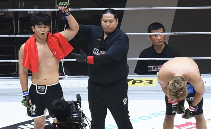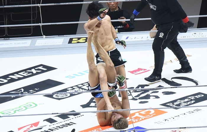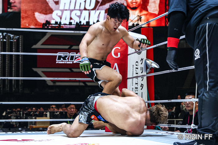 立ち上がる佐々木を首投げでテイクダウンする中谷がヒジ、パウンド。佐々木は脱出しようとするも今度は中谷がしっかり抑え込んでパウンドを打ち続けた。