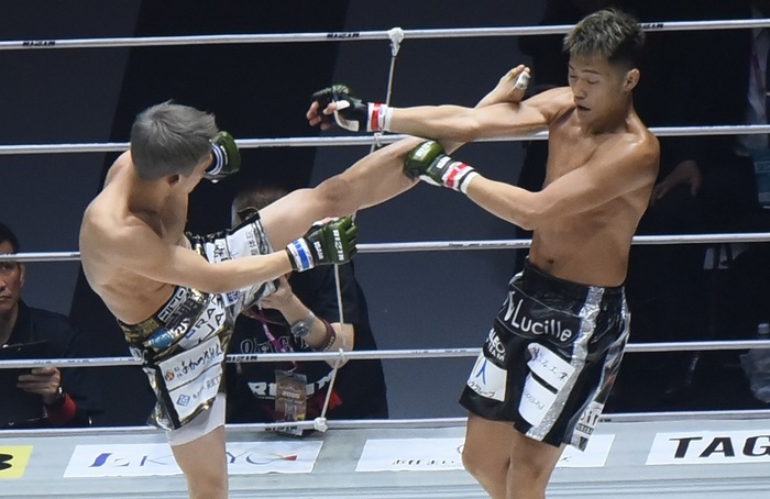 左インローを当てた秋元。高木も右前蹴り。前手争いから高木は組んでコーナーに押し込むが、秋元は右ヒザを股間に。ローブローで中断。