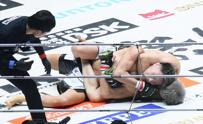 3R、左関節蹴りの高木。左インロー。右を当てる秋元にシングルレッグの高木。タックル返しから首を巻く秋元はバックを奪い4の字ロックも、正座して立ち上がる高木の詰めにヒザ突く秋元は左ボディも。高木は跳びヒザで詰めて左右からシングルレッグ、さらに左右からダブルレッグテイクダウン! 首を抱える秋元に高木は尻を着かせて、立ち際に背中に。ダブルアンダーで両脇差して落とされない高木はシングルバックに変えてリアネイキドチョーク狙い。腰をずらした秋元がバックに。高木の正対際にツイスターを狙うがゴング。