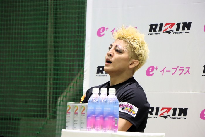 左目のまぶた上をカットし、左目が腫れた痛々しい姿。右足をやや引きずりながら歩いてきた鈴木だが、3月30日の『RIZIN.50』香川大会でカルシャガ・ダウトベックと激闘を繰り広げてからの短い期間での調整、その試合で負った怪我のことなどは一切口にしなかった。