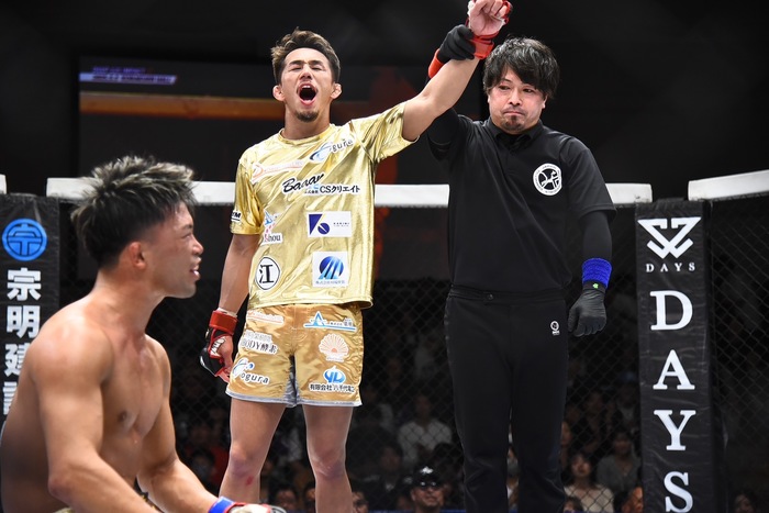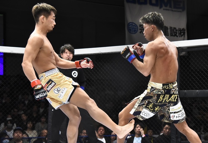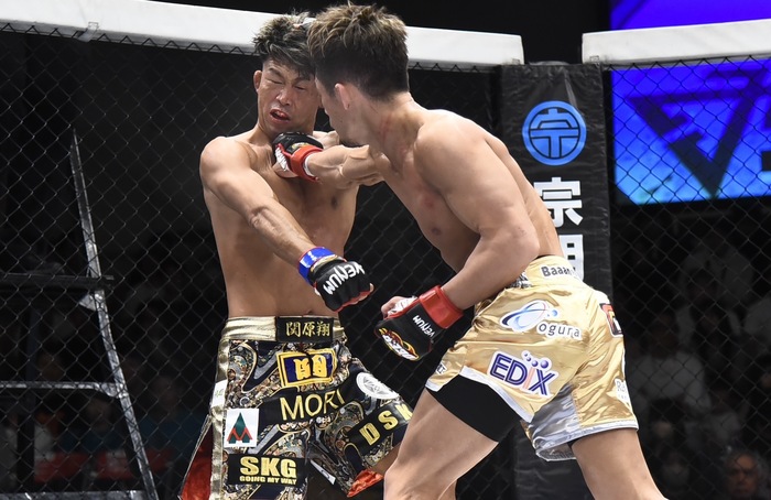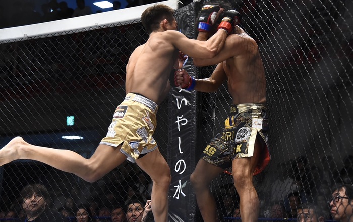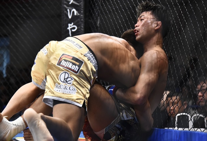 2R、左で飛び込む関原。中央に回る村元は右を突いてダブルレッグ、その際で脇を潜りバッククリンチに。正対し離れる関原。右アッパーから左を狙う。サウスポー構えになる関原は右前手フック。インロー。圧力かける村元が関原の入りに右を当てるとダブルレッグから右。しかし、すぐに押し戻す関原が右カーフ! 2発当てる関原は左ジャブも。