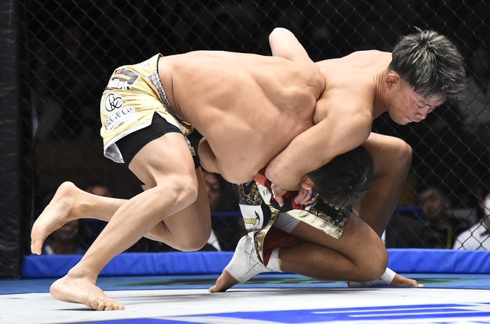 被弾した村元だが足を手繰りに。関原はケージ背に立ち上がり。村元の右に左を返すと、村元が関原のローにダブルレッグテイクダウンでゴング。