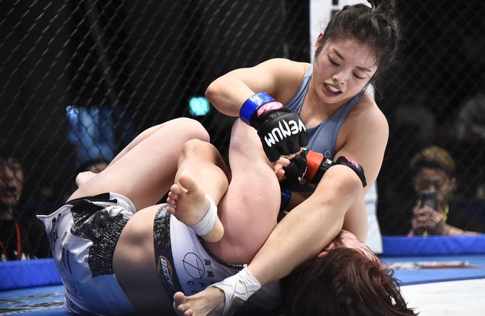 1R、回転速い打撃のイェジはダブルレッグテイクダウン。ギロチンスイープの大島はトップに。イェジはディープハーフから潜り。ヒジ打つ大島に、イェジも下から腕十字狙い。上四方から左脇をすくい腕十字もまたいで外すイェジは内ヒールに。ヒザを抜いてトップを奪う大島の足関節狙いにトップを取るイェジ。