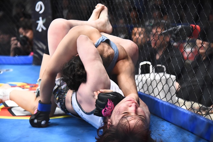 サイド奪うイェジはマウントに移行。大島は腰を押して足を戻すが、スイープは出来ず。フルガードの大島に左足をパスするイェジは左のパウンド! 大島は背中を着かされたままゴングを聞いた。判定は29-28×3でイェジが勝利。