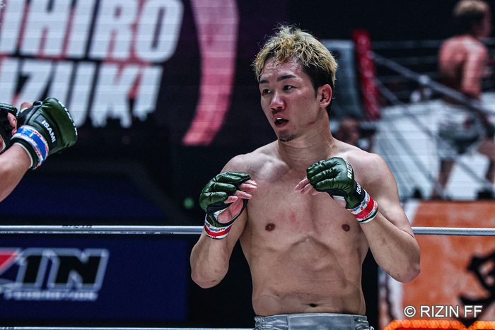 そして、「景色も変わってきたと思うんで、またべルトに絡んでいくような相手とやりたいと思います。まだまだ強くなれると思います。だいぶ成長したんだ、俺、この1年で。フェザー級のベルトって俺のために作られたベルトなんで、獲りに行きたいと思います。シェイドゥラエフとかね、めちゃめちゃ強かったけど全然俺はいけると思うんで。俺の格闘技の才能が1番あると思ってるんで。また新しい章の始まりです。皆さん楽しみにしててください」と、自分の成長を確信し、再びRIZINフェザー級のベルトを目指して戦っていきたいと告げた。