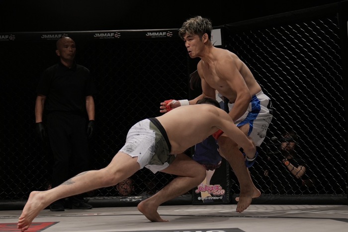 亀から巻き込み狙うサカイだが潰してサイドからパウンドは張。サカイの立ちにはボディロックテイクダウン。足関節狙うサカイを潰した張がサイドバックから細かいパウンド。サカイの立ち上がりに後方へ豪快に投げて、ホーン。