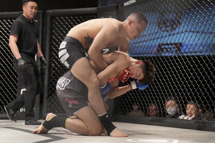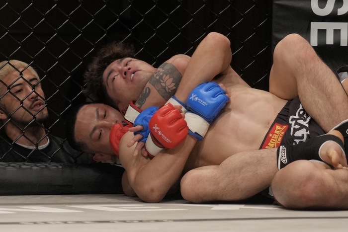 小野のアームロック狙いを潰してバックマウント、パウンドからリアネイキドチョーク狙い。左腕な巻けたが、右腕が脇下から抜けず。左のパウンドに切り替えた前田に、正対しかけた小野だが、前田もすぐにバック解除でがぶり、再びリアネイキドチョークへ。組めたが、後ろ手を剥がした小野。前田は背後からパンチでホーン。前田が取り返したラウンドに。スプリット判定で小野が接戦を制した。