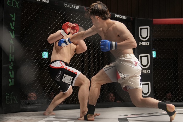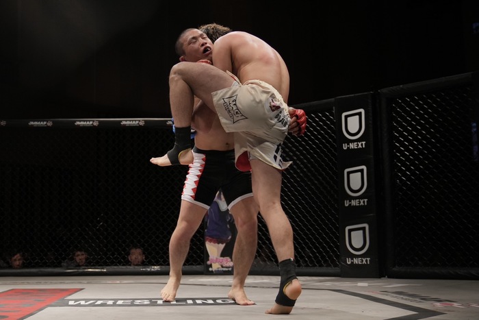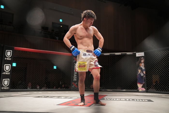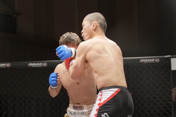 2R、身体ごと右をぶつけていく笹崎に、かわしてダブルレッグのタカリンダマン。しかし組んでヒザの笹崎がバッククリンチ。正対したタカリンダマンに、突き放す笹崎は右。かわしてダブルレッグもタカリンダマンを首を押さえてがぶった笹崎。シングルレッグでケージまでドライブするタカリンダマン。ジャッジ2者タカリンダマン。1者が笹崎。
