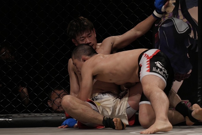 ケージまで這って上体立てて座るタカリンダマン。腰を抱いて引き出そうとする笹崎。立つタカリンダマンは両差しから支え釣り込み足でテイクダウン! 笹崎の立ち際にギロチンチョークも頭抜いた笹崎が立ち際にパウンド。立つタカリンダマンを崩してパウンドしてホーン。判定3-0で笹崎が勝利。