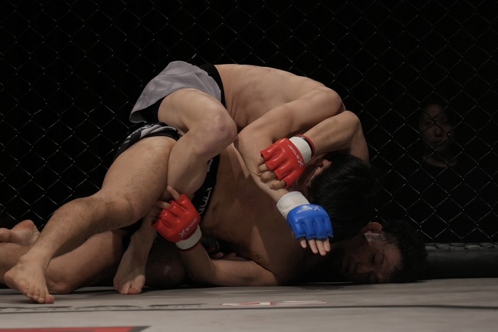 1R、サウスポー構えの田中、オーソの鈴木。左ハイの田中に、鈴木から組んで左差しで右に崩してテイクダウン、すぐにパウンド。バックを奪い、リアネイキドチョークを極めた。